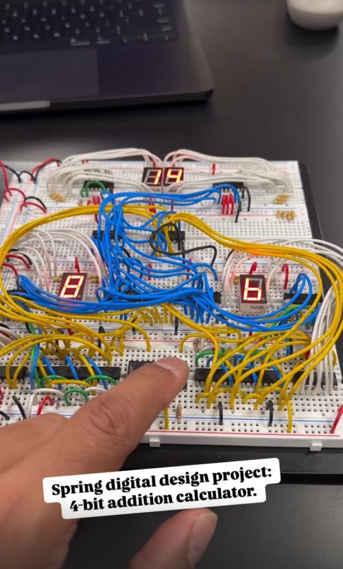 In this project, we successfully built a simple 4-bit binary calculator that can calculate values up to 18 using the addition method. We were able to complete the project using a single 4-block breadboard provided by the professor. For our design, we used two asynchronous counter blocks made of JK flip-flops and two full adders to sum the output of the counters. In addition, we used four 7-segment displays to display the results of the counters and the final sum.